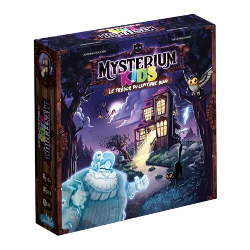 Mysterium Kids est un jeu de déduction à communication limitée. Les joueurs doivent identifier des bruits pour trouver le trésor du fantôme. Il se joue de 2 à 6, dès 6 ans, pour des parties de 21 minutes environ.