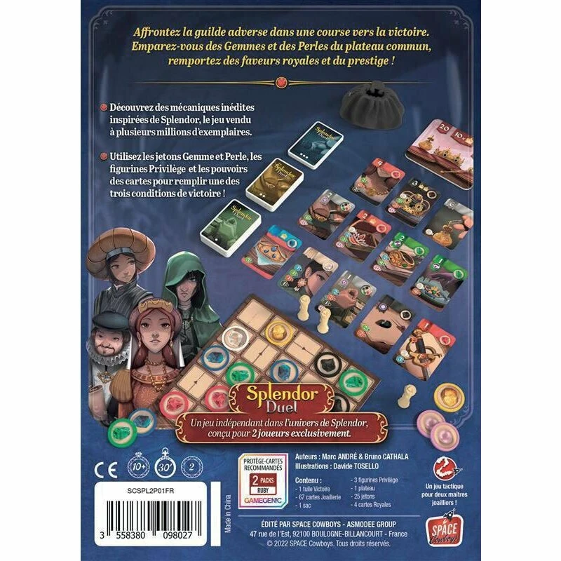 Splendor Duel est un jeu de stratégie dans lequel les joueurs incarnent des joaillers en quête de mécènes. Il se joue à deux, dès 10 ans, pour des parties de 30 minutes environ.
