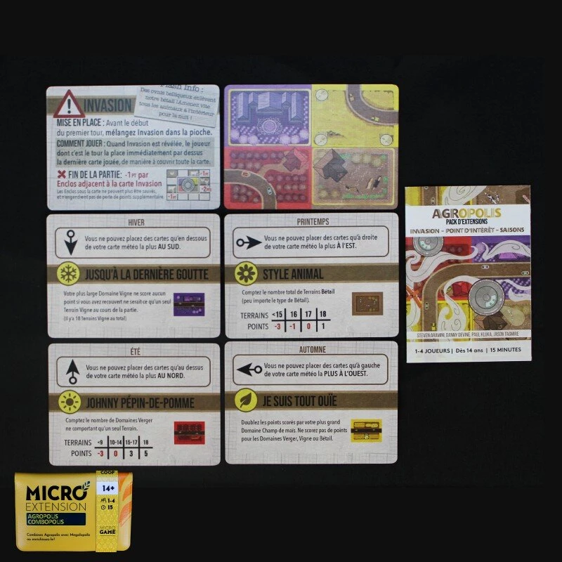 Cette extension permet d’ajouter de nombreuses manières de marquer des points, de nombreuses cartes qui vont bouleverser le paysage du jeu et la possibilité de combiner Agropolis & Mégalopolis ensemble.