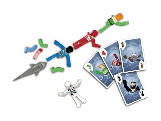 Contenu : 6 figurines articulées, 1 requin en colère, 2 planches d’autocollants, 42 cartes, le livret de règles.