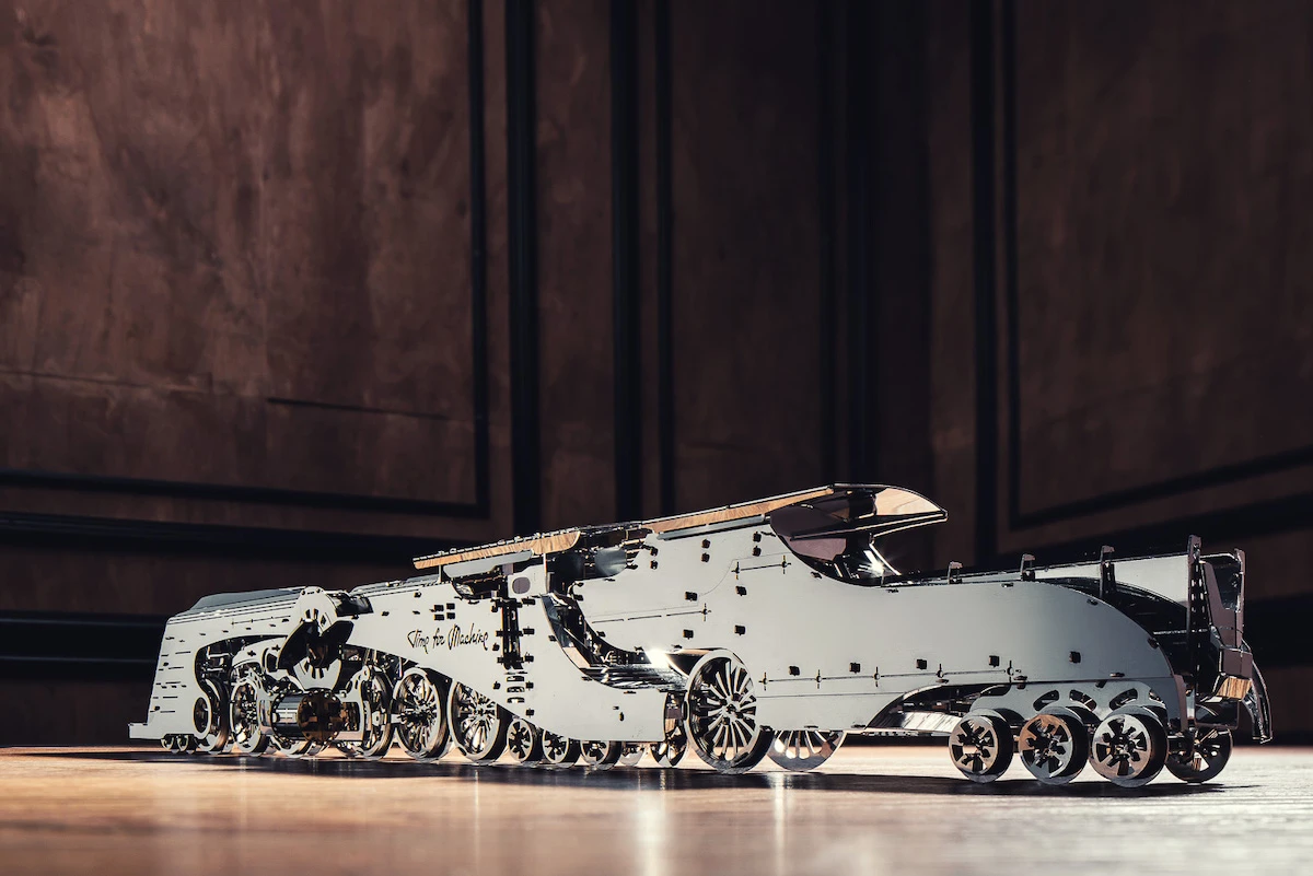 Ces locomotives semblaient futuristes et fascinantes. La Dazzling Steamliner est le modèle haut de gamme de notre collection. Le modèle est entraîné par un ressort mécanique. Sur le dessus et sur les côtés, vous pouvez observer le mouvements des roues et les engrenages intérieurs du train. La disposition des roues rappelle la célèbre Union Pacific Big Boy. D’une disposition d’essieux 4-12-6, l’échelle du modèle est de 1:64. L’écartement des rails est de 24 mm. Le tender à charbon peut être décroché de la locomotive.