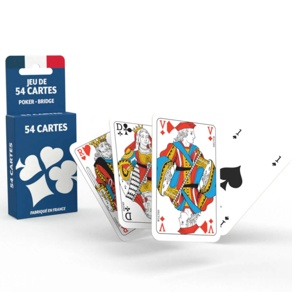 Ce jeu de cartes est composé d’une bonne dose de savoir-faire et de patrimoine français, une tonne de convivialité, beaucoup de Coeur, des règles simples, du carton PEFC bon pour l’environnement, un soupçon de chance et une pincée de triche en poudre pour mauvais joueur ! Pour s’amuser partout en famille ou entre amis et jouer au Poker, Bridge, et tout autre jeu de cartes nécessitant un jeu de 54 cartes !