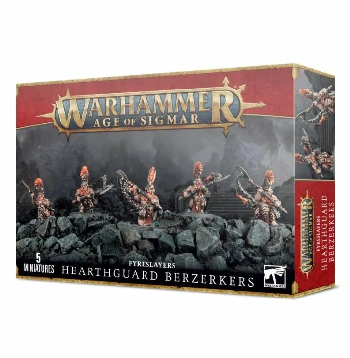 Ce kit plastique contient toutes les pièces nécessaires pour assembler cinq Hearthguard Berzerkers, armés de doloires de berzerker à deux mains et de haches de jet de pyracier. Très peu protégés, la chair incrustée de rune d’ur-or, ils arbirent des barbes démesurées et des crêtes de cheveux qui dépassent de leurs heaumes de drac. On peut, au choix, les équiper de bardiches claqueflammes, et une des figurines peut être assemblée en tant que Karl, le chef d’unité, nanti d’une crête spéciale et d’une hache modifiée.
