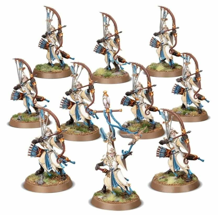 Les maîtres archers que sont les Auralan Sentinels manient des arcs aelfiques sophistiqués capables de décocher en tir tendu ou en cloche. Quand leur officier High Sentinel imprègne leurs flèches de sa puissance, ils sont encore plus redoutables.