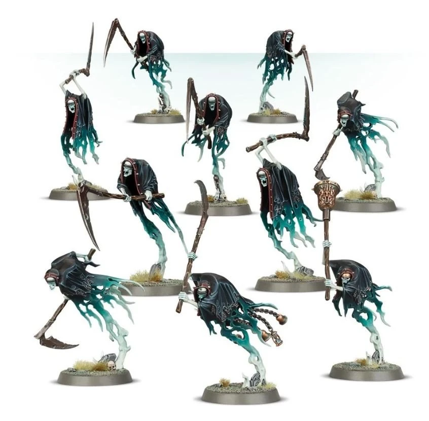 De leur vivant, les Grimghast Reapers étaient des tueurs prudents et méticuleux. Dans la mort, ils ne cessent jamais de trancher l’air de leurs armes et fauchent impitoyablement et inlassablement l’ennemi, un rang après l’autre. Comme d’horribles automates, ils répètent sans cesse leurs mouvements déchirants et fatals. Ces spectres sont vifs, mais lorsqu’ils se fendent pour attaquer, leurs mouvements sont saccadés, à l’opposé de la grâce des gestes des vivants. Ils semblent se déplacer par à-coups convulsifs, et avec une rapidité déconcertante.