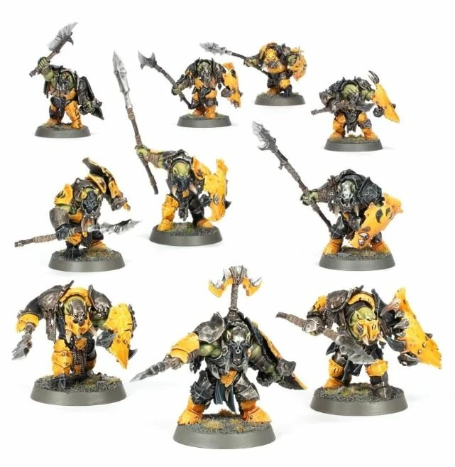 Les Durboys Orruks se ruent dans la mêlée en poussant des cris déments et dans le boucan de leurs armures de plates en fonte. Ces hordes de combattants féroces et couturés de cicatrices se fraient un chemin à travers les rangs ennemis à l’aide de toutes sortes d’armes grossières mais affreusement tranchantes, repoussant les représailles et les ennemis malchanceux à coups de boucliers lourds.