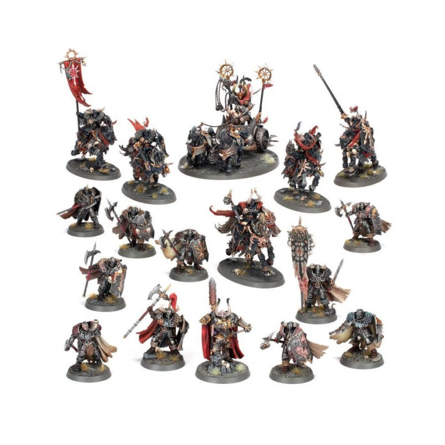 Les Esclaves des Ténèbres parcourent les Royaumes Mortels au nom d’Archaon l’Élu Éternel, de Be’lakor le Maître des Ténèbres et des Dieux du Chaos eux-mêmes, combattant en permanence pour écraser la vision oppressante de la paix de Sigmar. Ils ont souffert et fait des sacrifices pour conquérir ces terres, et ils ont infligé des souffrances inouïes. Désormais, personne n’arrêtera leur élan retrouvé. Leurs cortèges d’armures du Chaos, les sabots broyeurs de leurs chevaliers et les roues faucheuses de leurs chariots dévastent le champ de bataille en une marée implacable.