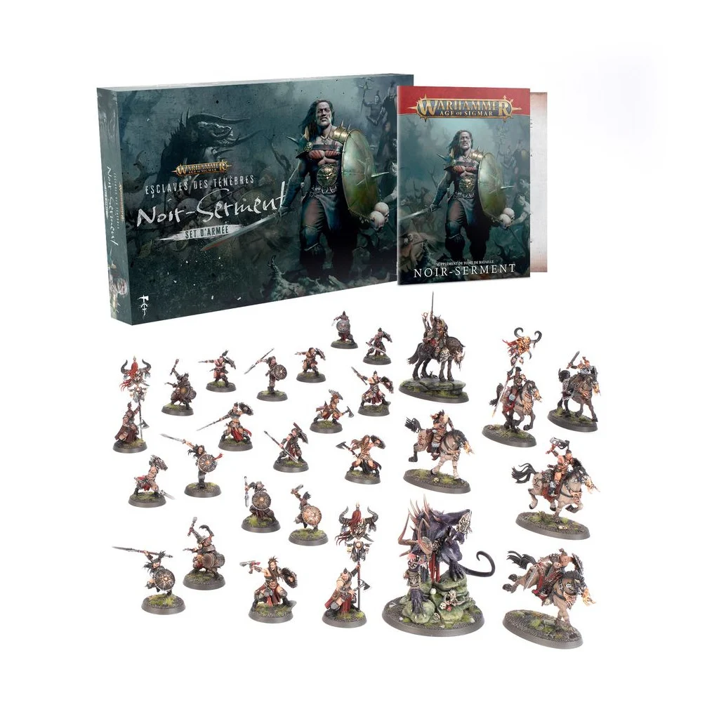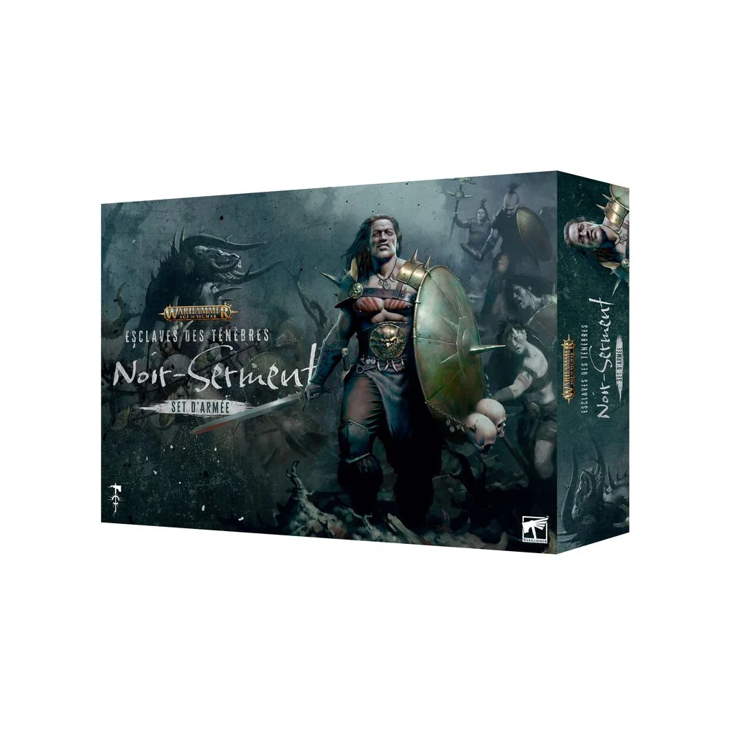 Depuis les étendues sauvages ensanglantées des Royaumes Mortels fondent les impitoyables pillards des Noir-serment. Comptant parmi les terrifiants Esclaves des Ténèbres, ces tribus humaines ont prêté le serment de perpétrer carnages et boucheries sous le regard de leurs dieux maléfiques, et elles l’accompliront coûte que coûte, car s’ils échouent, leurs âmes seront damnées. Descendants des malheureux humains abandonnés lorsque Sigmar s’est retiré à l’abri des Portes d’Azyr, les Noir-serment ont conclu des pactes avec les divinités de la ruine pour survivre à ce qui aurait dû signer leur fin. Aussi impitoyables que fiers, ils lancent des raids depuis leurs patries corrompues par le Chaos et accomplissent des vœux de massacre et de vengeance.