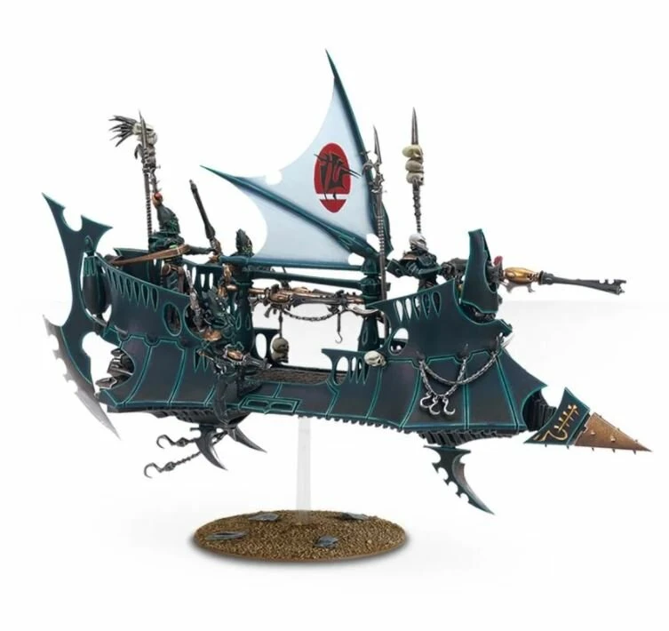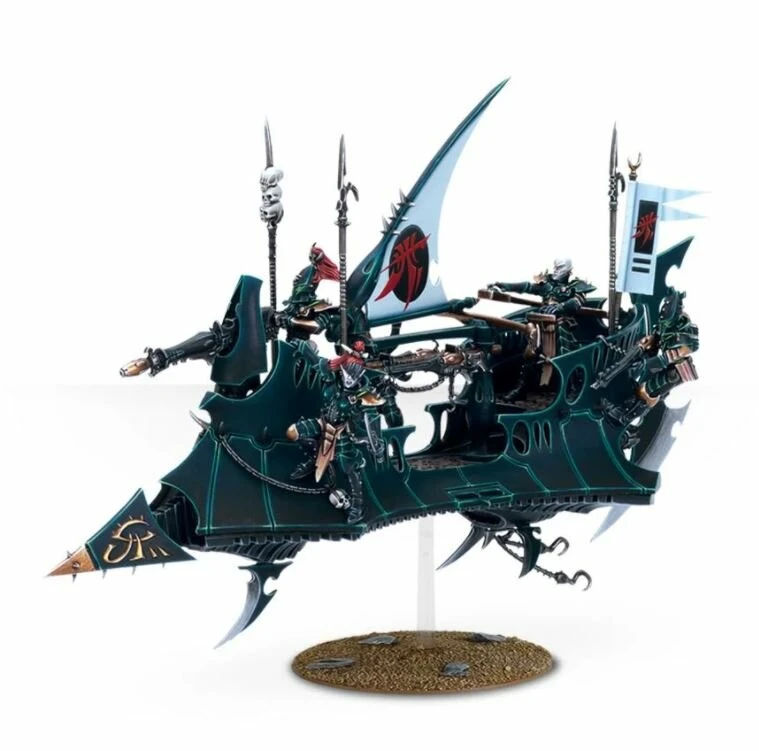 Les Raiders sont le transport favori des Drukhari. Ces aéronefs barbelés sont légers, extrêmement maniables et peuvent atteindre des vitesses prodigieuses Ils sont équipés d’une arme lourde dévastatrice montée sur la proue et sont décorés d’ailerons affutés et de quilles acérées pour massacrer l’ennemi.