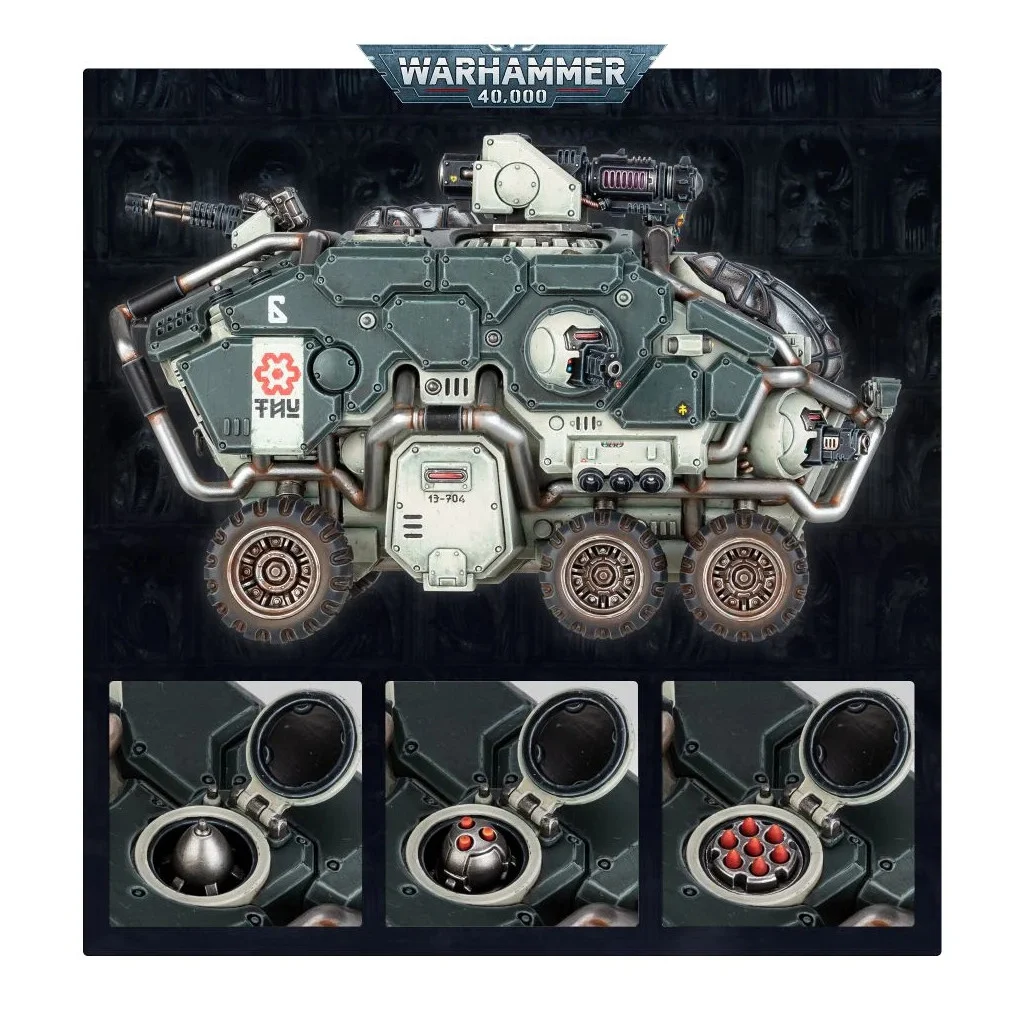 L’Hekaton dispose également d’un autocanon MATi-R tourné vers l’arrière et un scanner panspectral pouvant être remplacé par un silo de missiles, contenant une ogive d’ire des Cognats, brise-montagne ou de vengeance ancestrale. Le char dispose de plaques de blindage renforcées, de trappes de transport sur tous les flancs pour déposer sa cargaison pugnace, et d’un pilote visible sous un écran de plastique transparent. Le kit contient trois têtes différentes pour personnaliser votre pilote, ainsi que des phares optionnels pour les arceaux avant.
