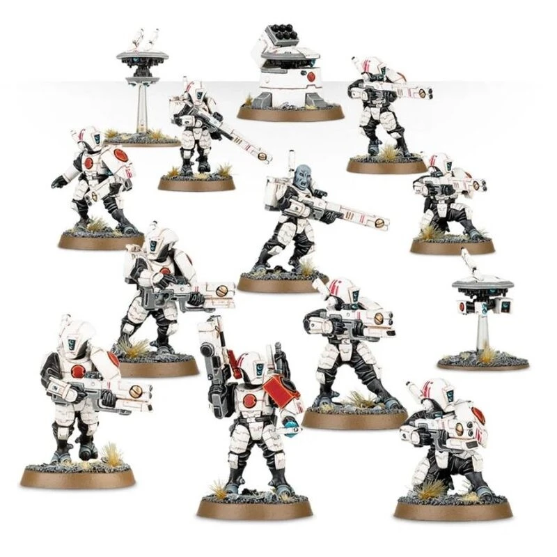 L’avenir n’est pas éclairé que par la lumière du Bien Suprême, il y a aussi celle des fusils à impulsions. Les vaillants Fire Warriors, forts de leur zèle et de leur foi absolue dans la destinée de leur peuple, se battent avec une ferveur irrésistible et une compétence enviable. Nantis des progrès technologiques effrénés des ingénieurs T’au, ils ont des armures légères mais solides et des armes puissantes et fiables. Une Fire Warrior Strike Team est un peloton de troupes de choc prompt à intervenir, qui dresse un mur de tirs à impulsions, jette des grenades à onde électromagnétique et dirige le feu d’une puissante tourelle d’appui tactique vers le peu d’ennemis qu’il reste.