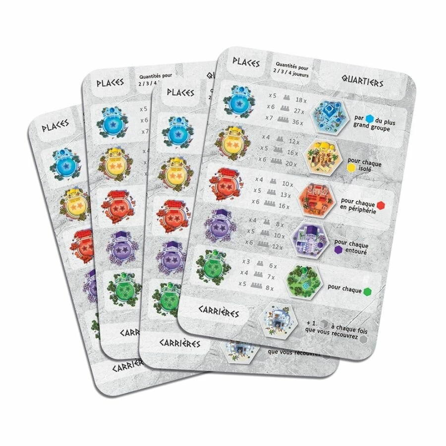Mais ce n’est pas si simple car chaque type de quartier a ses propres exigences et l’ordonnancement des tuiles exigera quelques réflexions pour optimiser le placement de chaque quartier. Seuls les plus malins sauront tirer partie des tuiles proposées et devenir les architectes les plus talentueux de la Grèce antique.