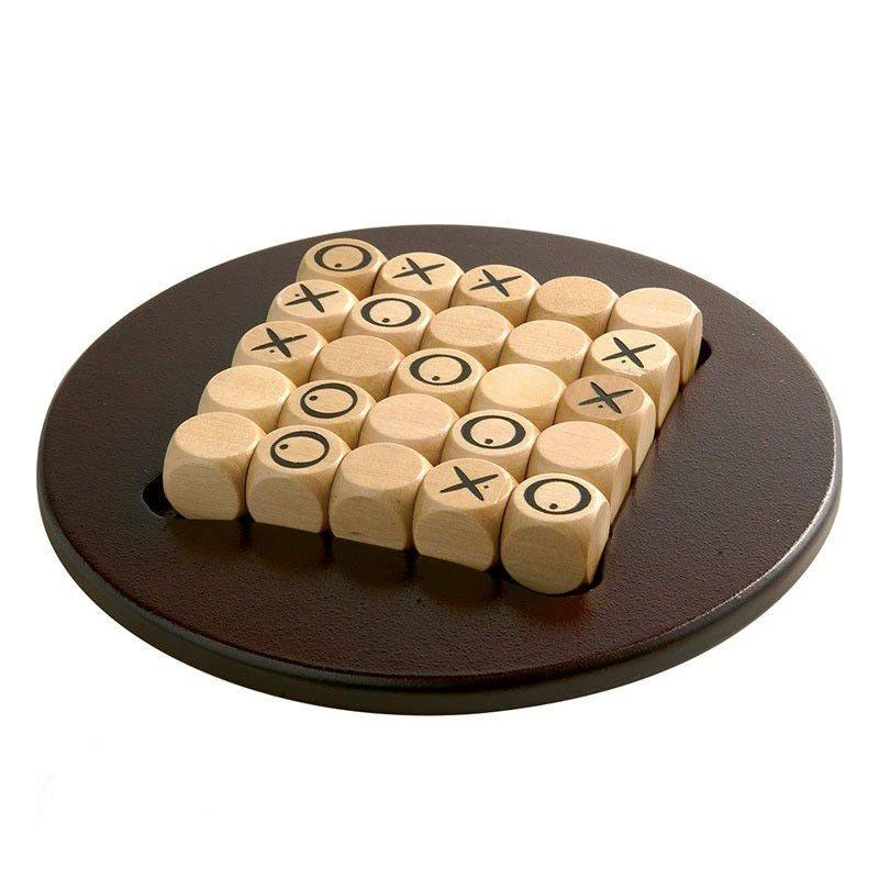 Contenu : 25 cubes pyrogravés en bois, un plateau en bois, un sac de rangement, une règle du jeu.