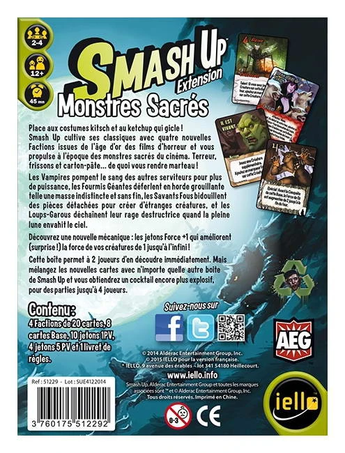 Voici la quatrième extension pour Smash Up, qui cultive ici ses classiques avec quatre nouvelles Factions issues de l’âge d’or des films d’horreur. Vous serez propulsés à l’époque des monstres sacrés du cinéma : terreur, frissons et carton-pâte… de quoi vous rendre marteau !