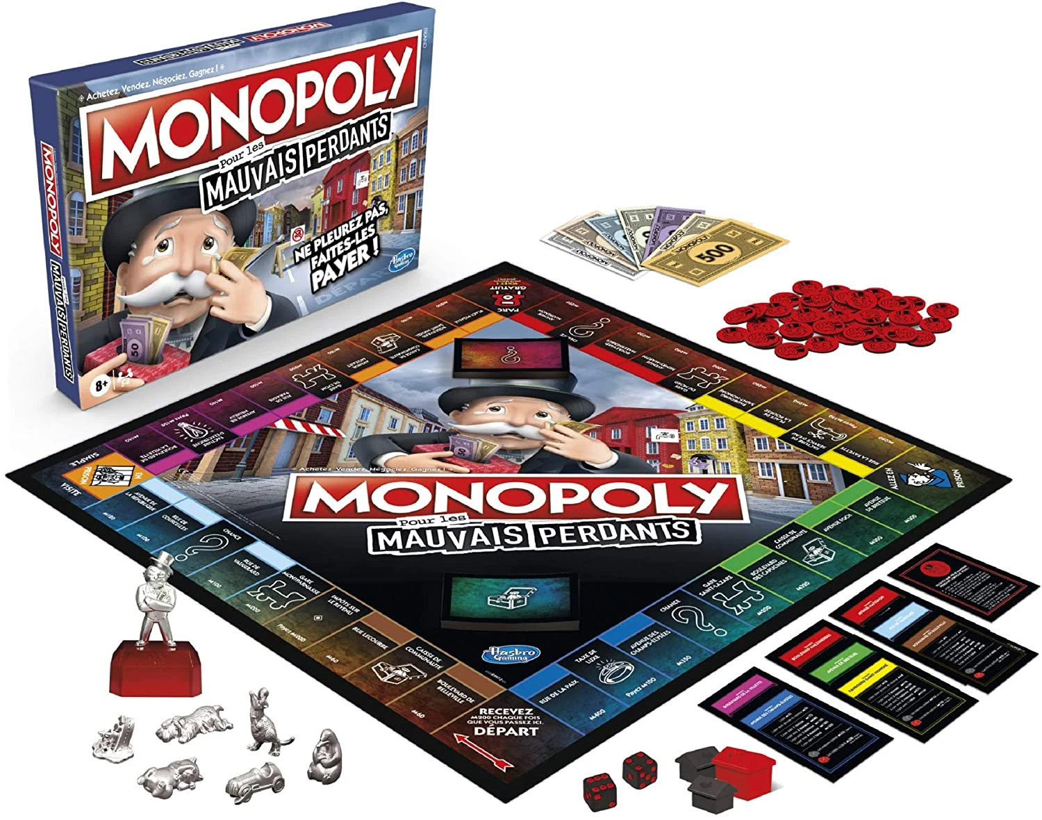 Monopoly Mauvais Perdants, le premier jeu de société où il est rentable de perdre. Ce nouveau Monopoly va révéler le mauvais joueur en chacun de nous. Lorsque tu iras en prison, tu payeras des loyers, tu feras faillite et tu seras récompensé.