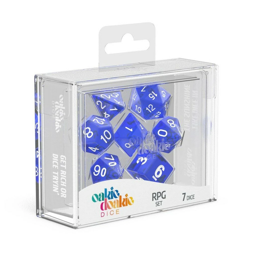 Step into your next adventure with the Oakie Doakie Translucent Blue RPG Dice Set. These stunning, crystal-clear dice capture the light like a mystical crystal ball, offering a glimpse into your character’s fate. Whether you are casting spells or striking a final blow, these dice bring a touch of elegance and clarity to every roll.