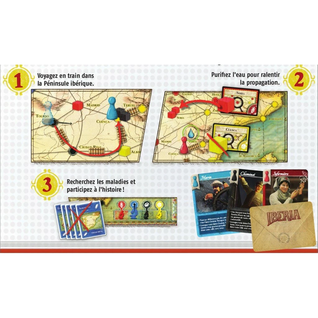 Nous sommes au milieu du 19e siècle et la péninsule ibérique est envahie par la malaria, le typhus, le choléra et la fièvre jaune. En tant que membres de la deuxième expédition philanthropique royale, vous devez empêcher ces quatre maladies de se propager. Pandemic : Iberia est un jeu autonome dans lequel vous pouvez découvrir une version historique du jeu coopératif qui a fait du premier Pandemic un classique. Endossez l’un des sept rôles, comme celui du médecin de campagne ou de l’agronome, et parcourez la péninsule à la recherche de chaque maladie. Vous voyagerez en calèche, en bateau et en train pour aider la population ibérique. En plus de soigner les patients et de partager vos connaissances, purifiez l’approvisionnement en eau pour ralentir la propagation des maladies ou construisez un réseau ferroviaire pour rendre les déplacements entre les hôpitaux plus efficaces. Quelle que soit la direction que vous prenez, vous gagnez ou perdez en équipe.