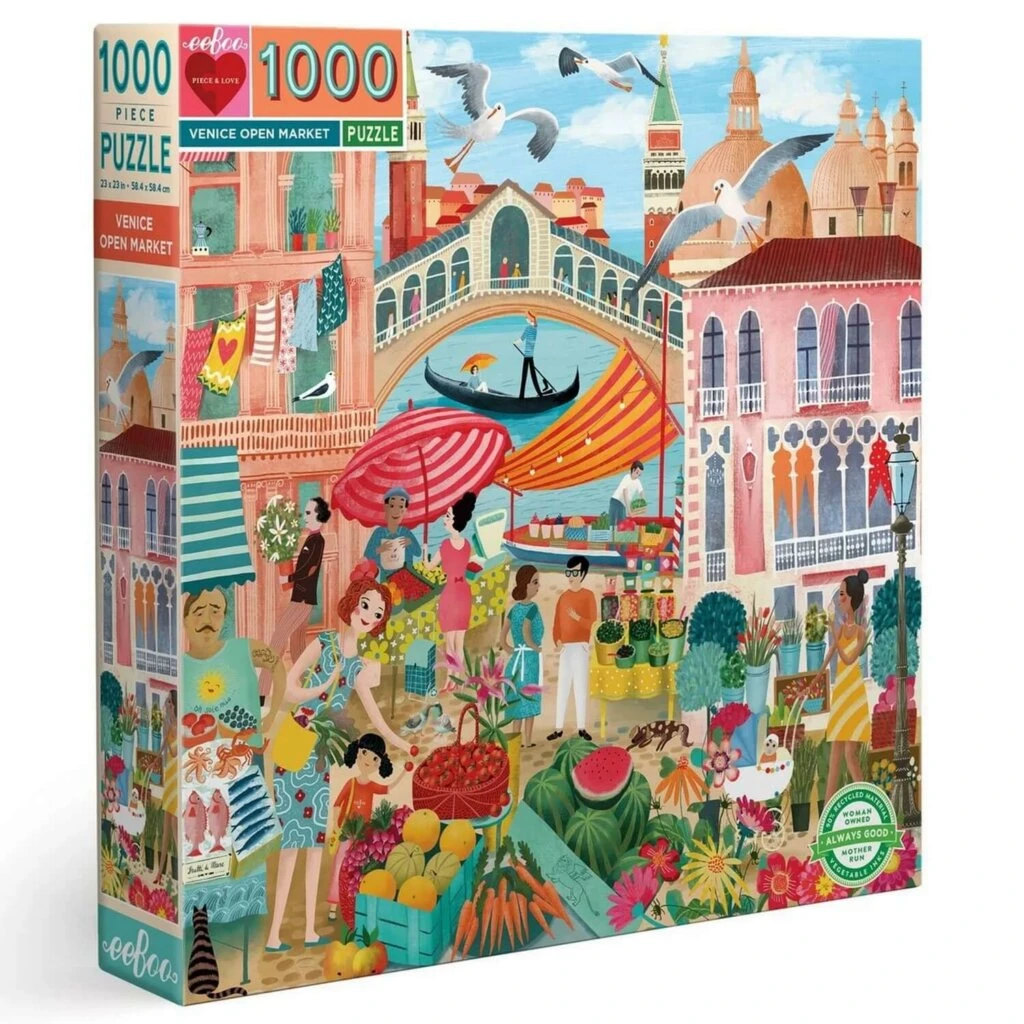 Le défi d’un puzzle de 1000 pièces, mais carré ! Sans haut ni bas, les puzzles de style familial d’eeBoo sont parfaits pour un groupe de travail autour de la table.