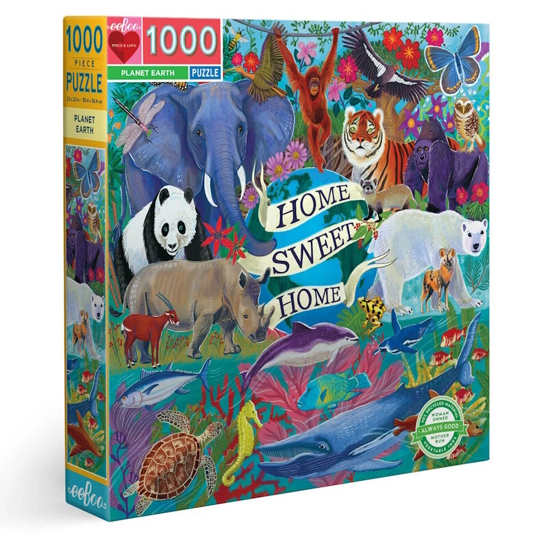 Le défi d’un puzzle de 1000 pièces, mais carré ! Sans haut ni bas, les puzzles de style familial d’eeBoo sont parfaits pour un groupe de travail autour de la table.