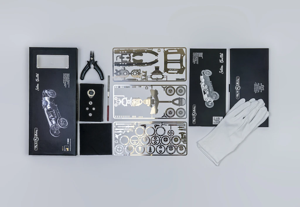 - Le kit: plaquettes de pièces, spirale, engrenages, pinces, lime, gants, chiffon de polissage ainsi qu’un manuel d’instructions.