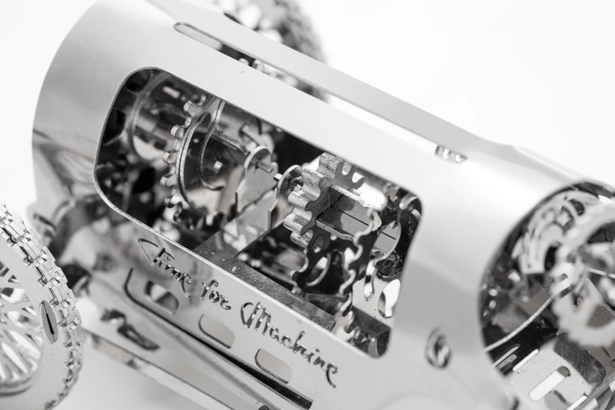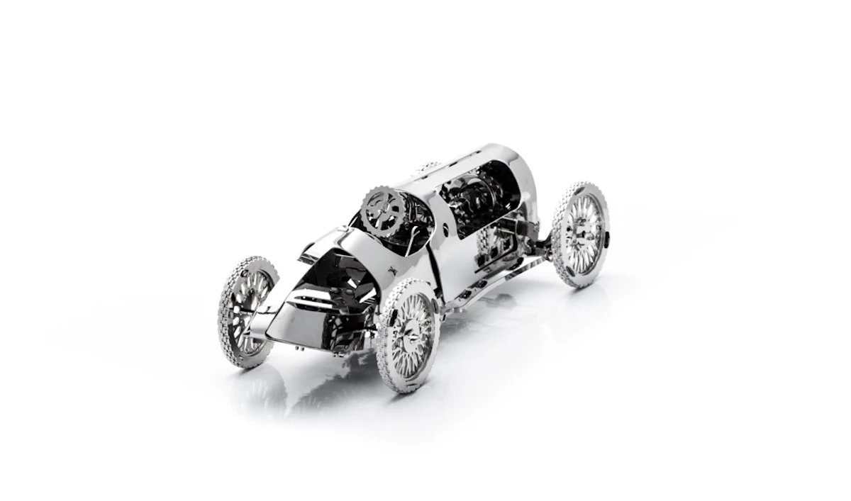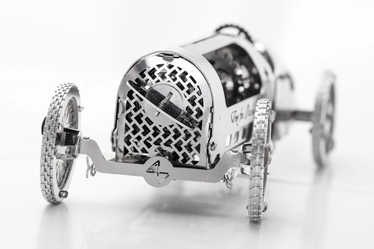 Le design de cette beauté est basé sur les voitures sportives de course du début du 20ème siècle. Sous le capot vous trouverez de beaux engrenages constituants le moteur. C’est une version élégante de la voiture de course rétro qui est propulsée par un ressort mécanique.