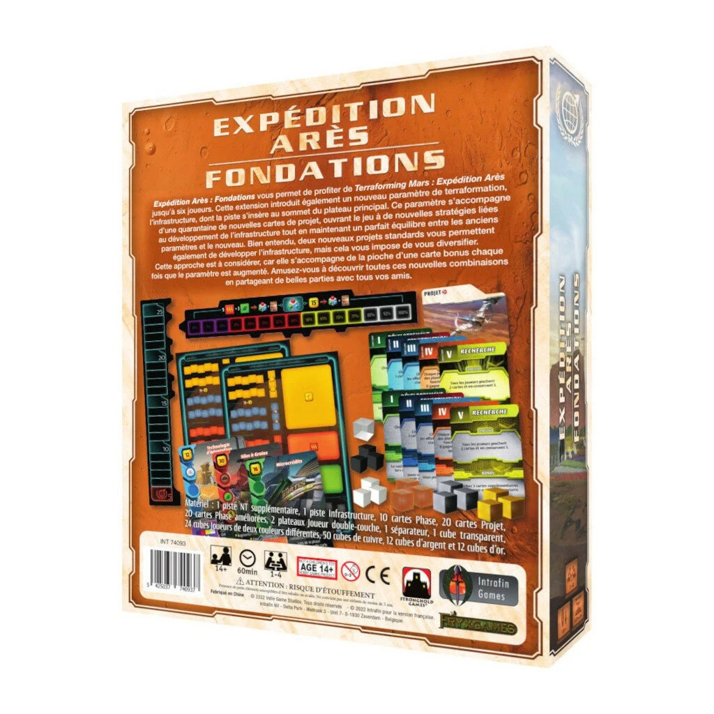 L’extension Fondations vous permet de profiter de Terraforming Mars Expédition Arès jusqu’à six joueurs. Cette extension introduit également un nouveau paramètre de terraformation, l’infrastructure, dont la piste s’insère au sommet du plateau principal. Ce paramètre s’accompagne d’une quarantaine de nouvelles cartes de projet, ouvrant le jeu à de nouvelles stratégies liées au développement de l’infrastructure tout en maintenant un parfait équilibre entre les anciens paramètres et le nouveau. Bien entendu, deux nouveaux projets standards vous permettent également de développer l’infrastructure, mais cela vous impose de vous diversifier. Cette approche est à considérer, car elle s’accompagne de la pioche d’une carte bonus chaque fois que le paramètre est augmenté. Amusez-vous à découvrir toutes ces nouvelles combinaisons en partageant de belles parties avec tous vos amis.
