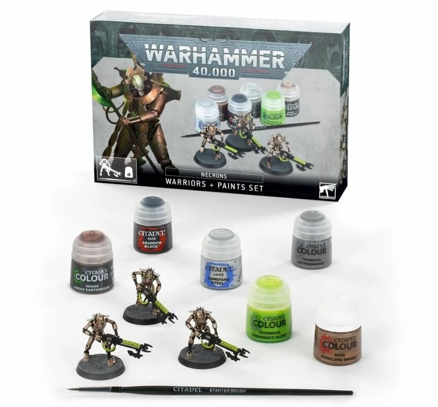Cette boîte est le moyen tout trouvé de commencer votre collection de Nécrons. Vous y trouverez trois Guerriers Nécrons en plastique aux poses variées, la peinture pour les préparer au combat et un pinceau pour débuter. Ces figurines sont emboîtables, et ne nécessitent que des pinces pour les dégrapper et assembler; pas de colle, pas de salissure.